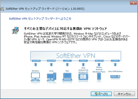 「vpngate-client-」という名前で始まるセットアッププログラムを起動し、画面の指示に従ってインストールを行います。